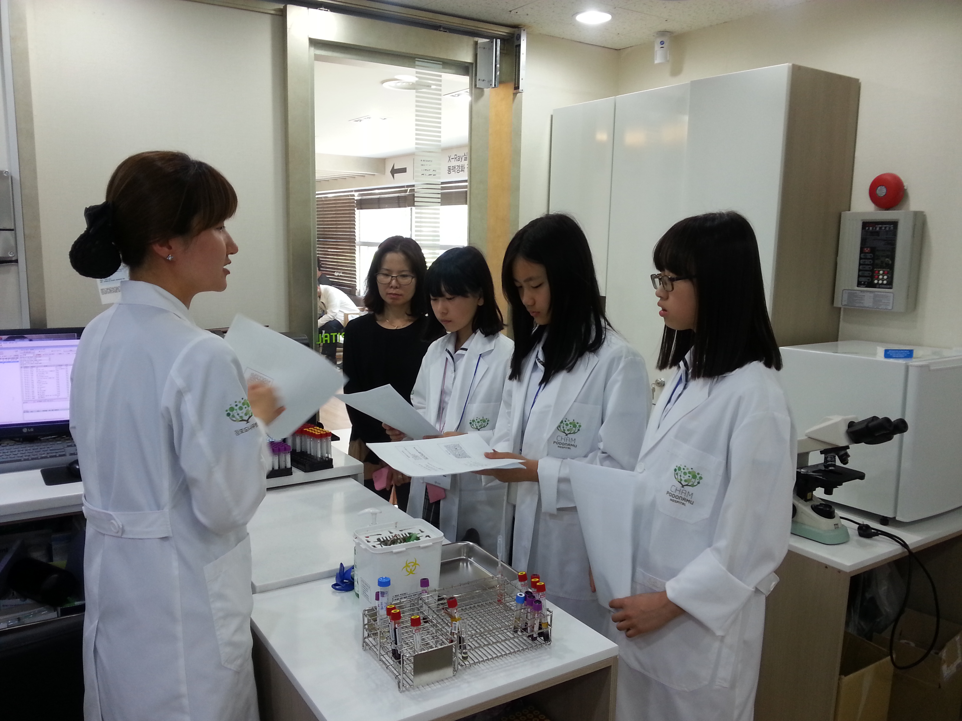 임상병리실에서 체험하는 모습입니다~모두들 신기하고 처음 보는 모습에 집중하며