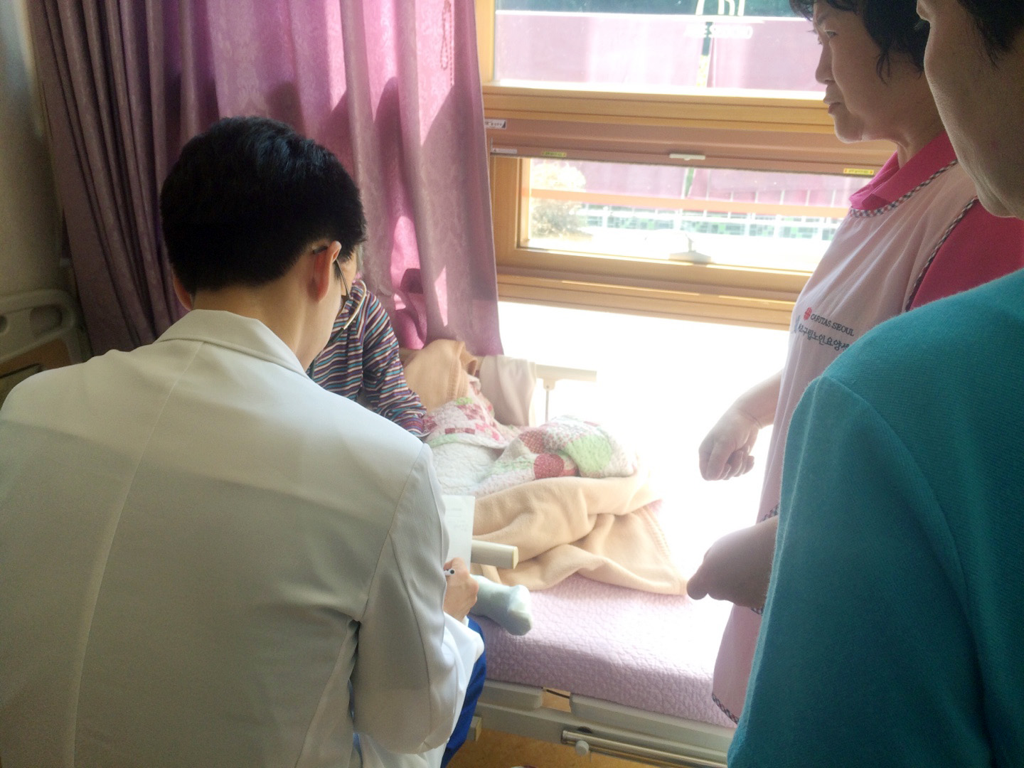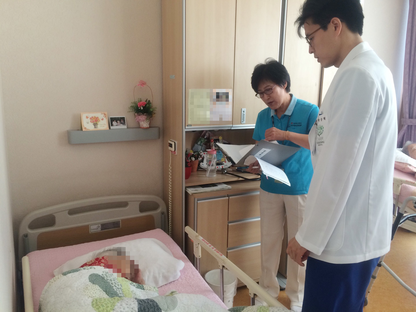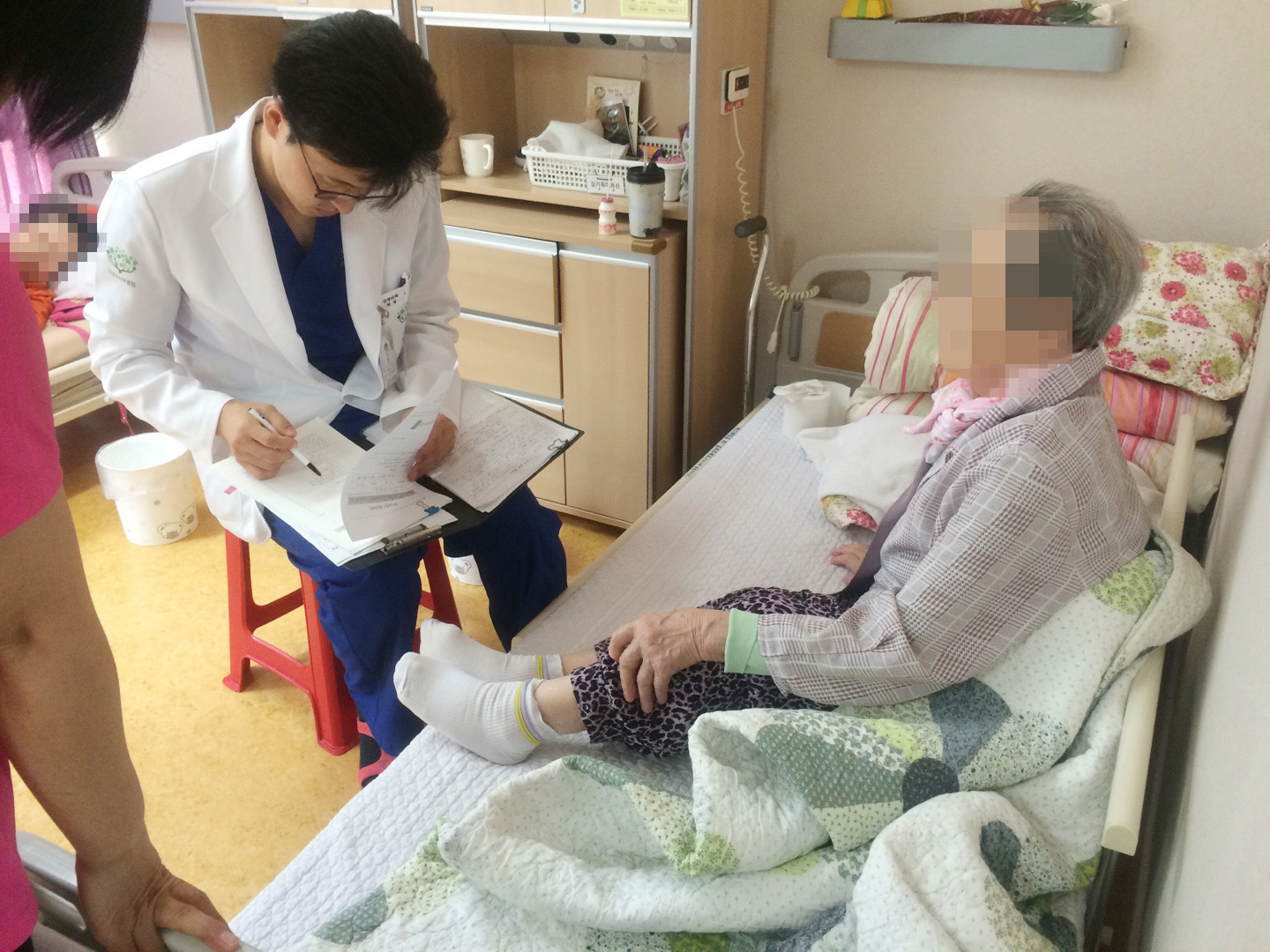 몸이 불편하여 침상에 누워계신 어르신들의 건강상태를 체크 하며