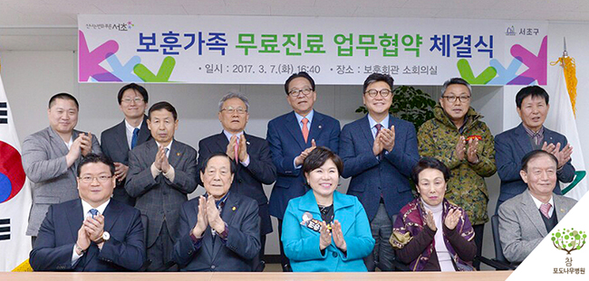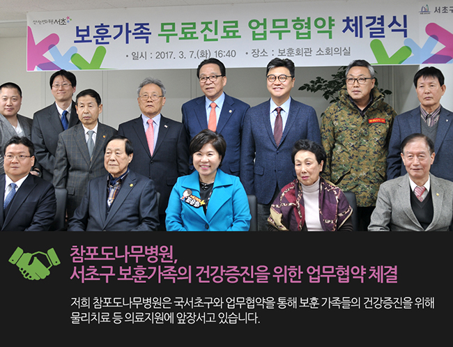 이와 관련, 지난 3월 7일 진행된 보훈가족 무료진료 업무협약식에는 조은희 서초구청장을 비롯하여 저희 참포도나무병원에서는 이동엽 병원장님이 참석하였습니다.