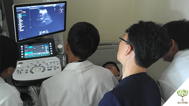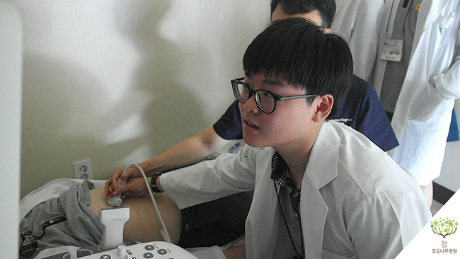 학생들이 직접 가운을 입고, 조영민 원장님의 설명아래 영상의학과 초음파 체험을 하며 신체 내부를 직접 관찰할 수 있는 시간을 가졌습니다.