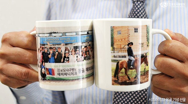 이처럼 몽골에서의 소중한 추억을 남기기 위해 저희 참포도나무병원에서 해외의료봉사대를 위해 깜짝 선물을 준비하였는데요. 바로 몽골에서의 추억이 담긴 사진을 컵에 담아 몽골 해외의료봉사대 전원에게 선물로 증정하였습니다.
