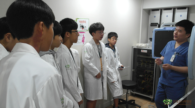 또한 신관으로 건너가 영상의학과와 임상병리실에서 이뤄지는 업무에 대해 설명을 듣고, 직접 영상장비를 통해 촬영하는 시간도 가졌습니다. 이어 재활센터에서는 청소년기에 주로 나타나는 허리질환 및 예방법에 대해 알아본 후, 청소년들이 직접 실천할 수 있는 동작들을 따라 해보며 유쾌한 시간이 되었습니다.