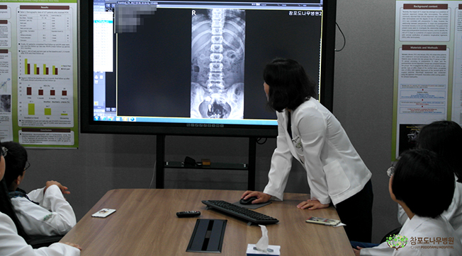 마지막으로 비수술센터 이시민 원장님의 강의가 진행되었는데요. 아까 영상의학과에서 촬영한 검사결과를 통해 청소년기에 주로 나타나는 척추측만증에 대한 여부 등을 알아본 후, 의사라는 직업에 대해 아이들이 직접 묻고 답하며 궁금증을 해소할 수 있었답니다.