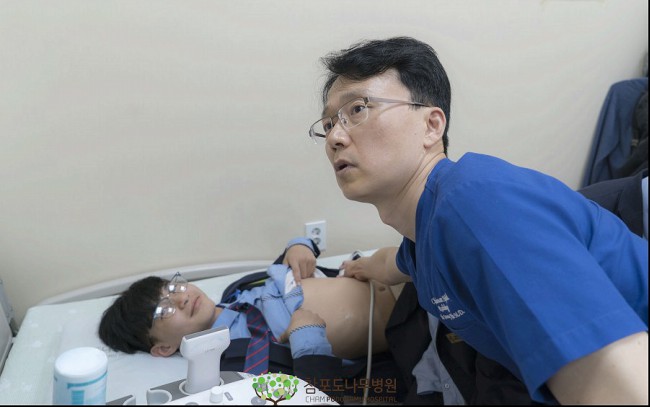 간단한 병원소개에 이어 그 첫번째 순서로 영상의학과 조영민원장님과 함께하는 초음파 검사 체험, 모두가 서로 검사를 받아보기 위해 손을 번쩍!! 아이들은 직접 의사가 되어보기도 하고 자신의 몸 속을 보기도 하면서 무척 신기했다고 합니다. 호기심이 완전 대단했습니다.