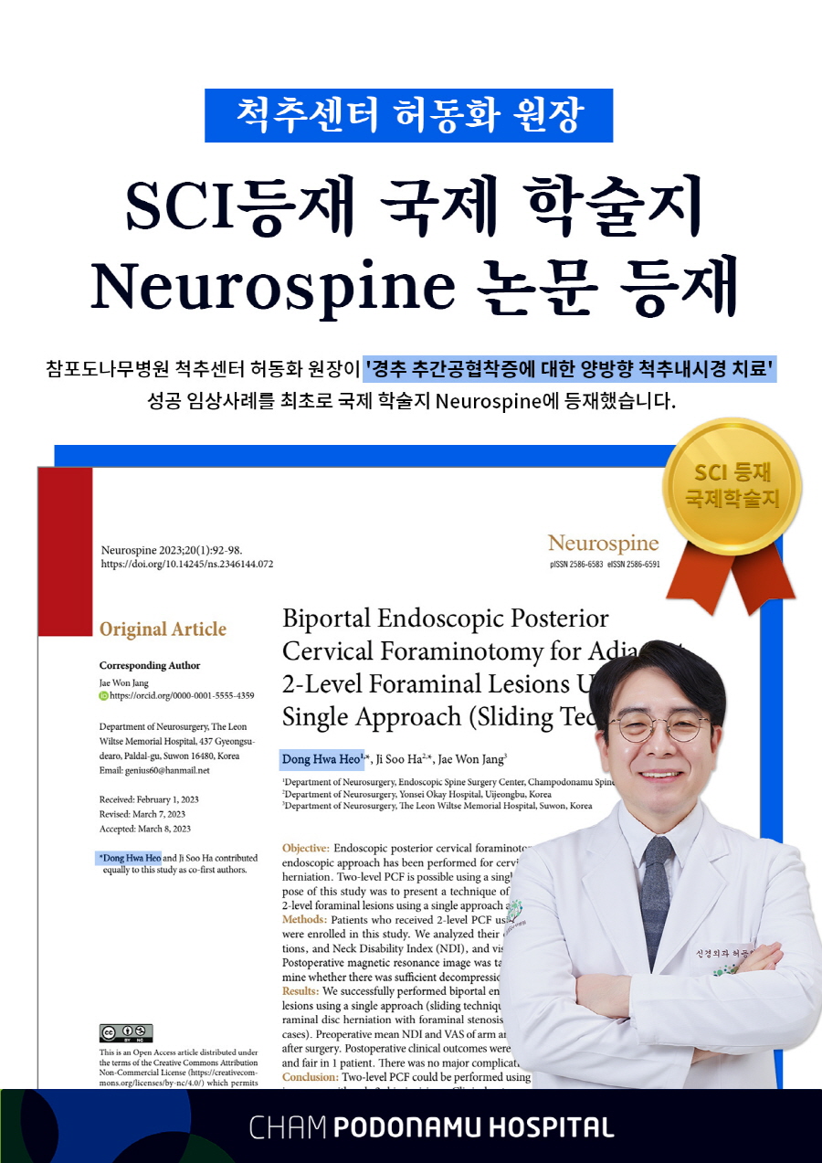 참포도나무병원 척추센터, ‘경추 추간공협착증에 대한 양방향 척추내시경’ 임상 최초 보고
