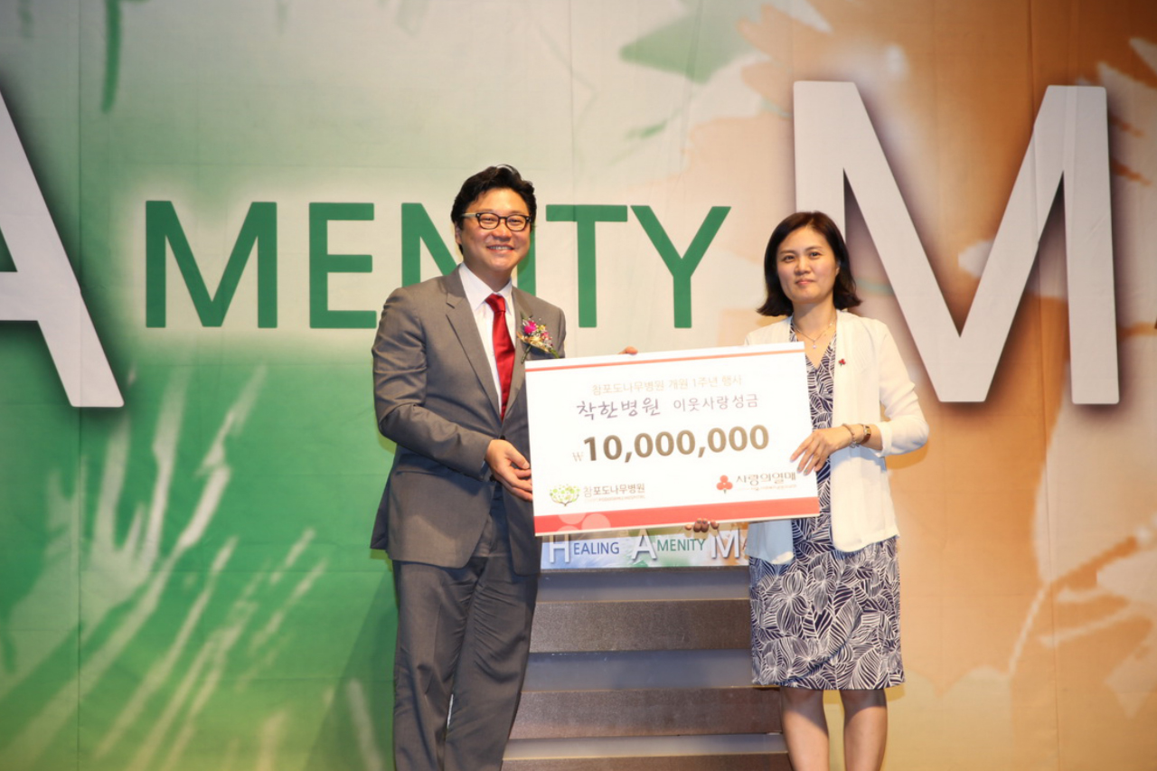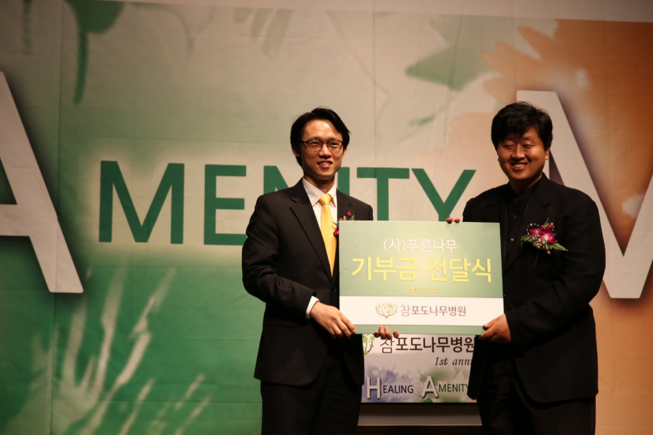 ‘나눔을 바탕으로 한 원숙한 치료’라는 큰 비전으로 여러분의 척추, 관절의 참 좋은친구가 되고자 노력하고 있는 저희 참포도나무병원의 개원 1주년 기념 행사에서의 가장 뜻 깊은 순서로는, 지난 1년간의 결실을 사회복지공동모금회 ‘사랑의열매’와 북한 어린이,장애인 지원, 문화교류, 인재양성에 앞장서고 있는 ‘(사)푸른나무’ 와 나눈 ‘기부금 전달식’이었습니다.