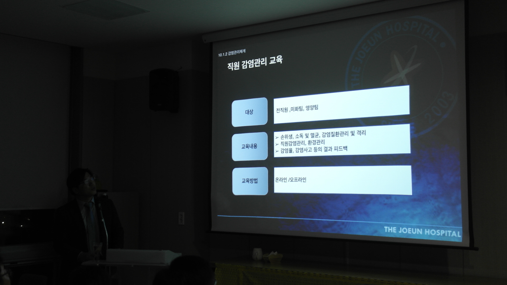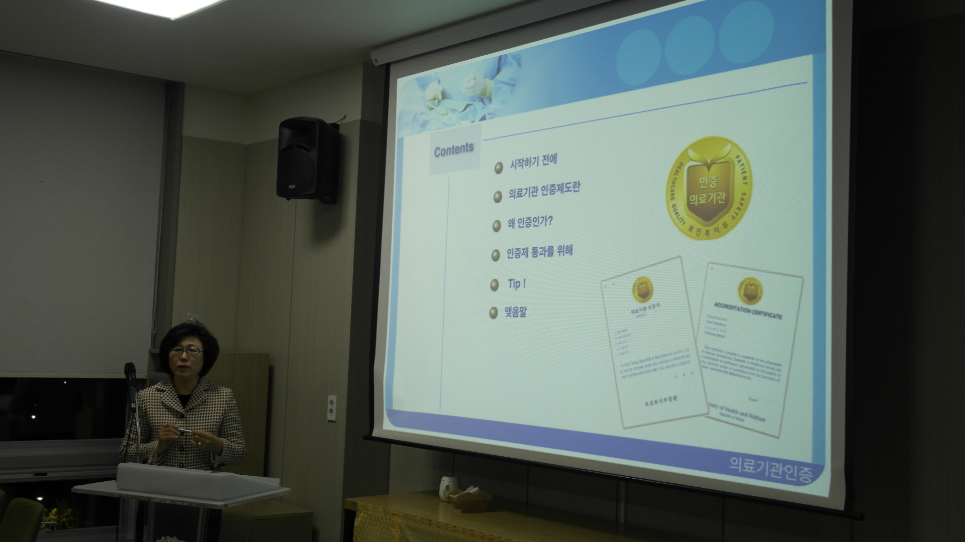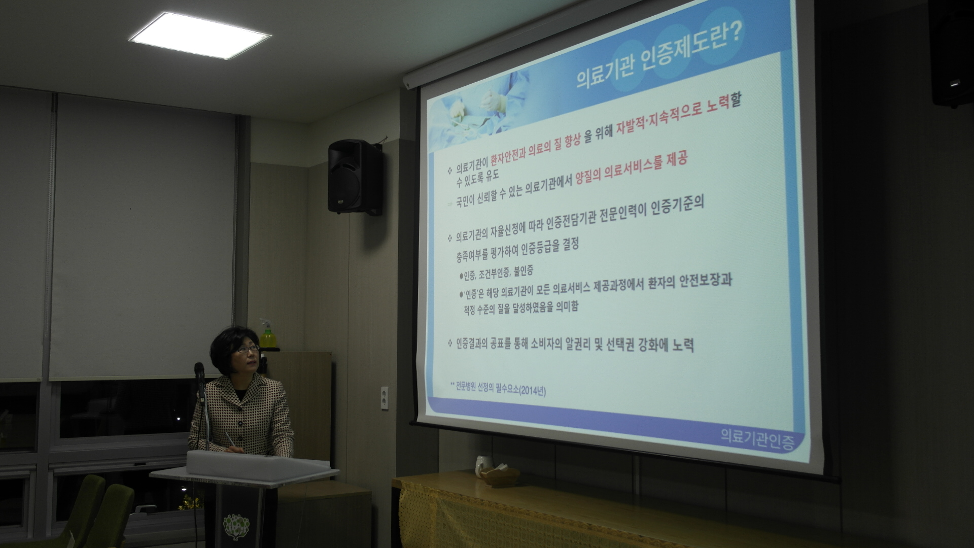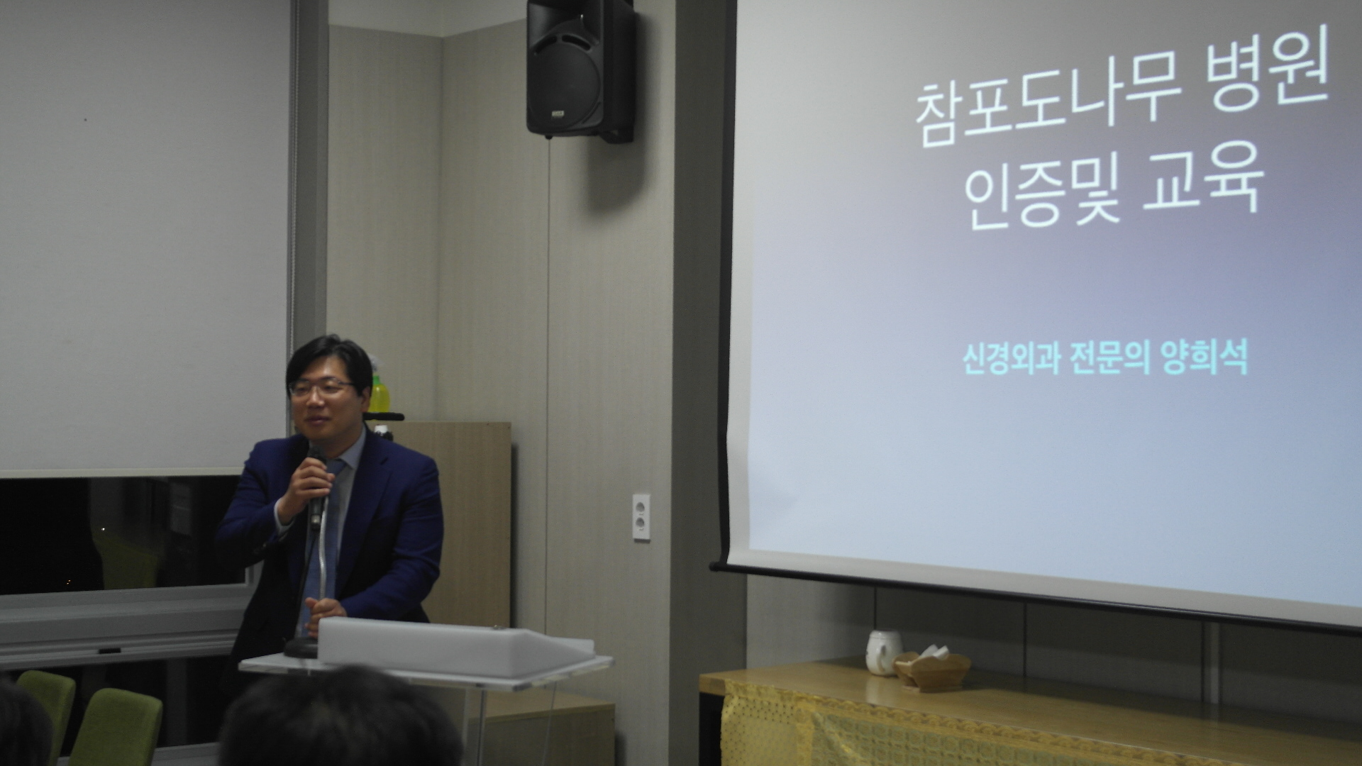 11월 13일 저녁에는 참포도나무병원 임직원들을 대상으로 병원 인증 및 교육 강의가 있었습니다. 교육중에는 신경외과 전문의 양희석 선생님과 중소병원 간호부서장 회장 김영숙 선생님께서 병원 인증교육 체계 및 절차와 환자분들에게 더 나은 진료를 위해 병원에서 할 수 있는 서비스 교육에 대한 설명을 진행하였습니다.